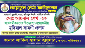 আয়নাল শেখ ফরিদপুরের ভাঙ্গা উপজেলার চুমুরদী ইউনিয়নের আউড়ামাঠ গ্রামের মৃত মোমিন শেখের ছেলে। তবে আয়নালের দূর্বিষহ জীবন যুদ্ধের সহযোগী হিসেবে পাশে দাঁড়িয়েছেন ‘আয়াতুন নেসা ফাউন্ডেশন’ নামের একটি সেবামূলক প্রতিষ্ঠান। শুক্রবার (২৫ জুলাই) সকালে প্রতিষ্ঠানের পক্ষ থেকে আয়নাল শেখের মুদিদোকানের মুদি-মালামাল ও তার ঔষধের জন্য আর্থিক সহায়তা নিয়ে ছুটে যান একদল সেচ্ছাসেবক।